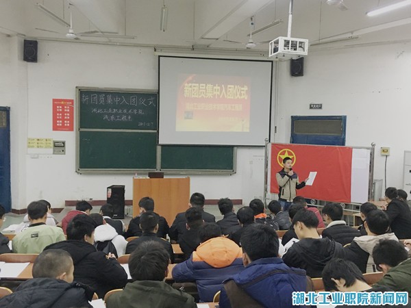 (员工记者 黄富军 柯海涛)“我志愿加入中国共产主义青年团,坚决拥护中国共产党的领导,遵守团的章程……”12月7日晚6:30,汽车工程系2017年新团员入团仪式在5209教室举行。汽车工程系团总支书记王雅坤参加仪式,仪式由系团总支副书记黄富军、王娜主持。经个人申请,各班团支部推荐,团总支审批通过,此次共有95名同学通过考核,参加入团仪式。王娜带领全体新团员进行集中宣誓,黄富军组织大家集中学习中国共青团的组织性质、历史简介以及团旗、团徽的含义,并重点学习习近平总书记对广大青年提出的殷切希望,勉励大家牢记习总书记的嘱托,“坚定理想信念,志存高远,脚踏实地,勇做时代的弄潮儿,在实现中国梦的生动实践中放飞青春梦想,在为人民利益的不懈奋斗中书写人生华章!”