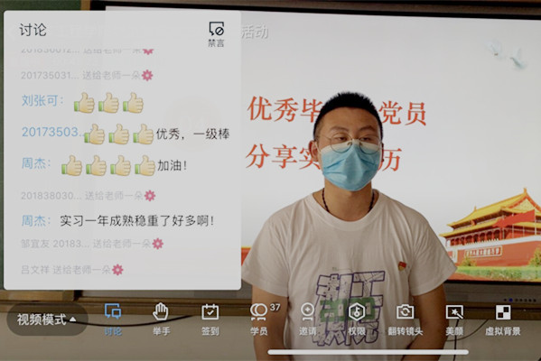 新闻网讯(通讯员 玉声)“当企业加紧生产要求连上两班时,有的人坚持不了选择离开,我也有想打退堂鼓的念头,但想到作为一名共产党员应当迎难而上,于是咬咬牙就坚持了下来……”,在东风小康实习的毕业生党员田金超与大家分享实习经历时感慨地说。6月19日下午,MK体育员工党支部通过腾讯课堂直播开展了一场别开生面的“线上+线下”主题党日活动。MK体育员工党支部书记曲杉主持此次主题党日活动。党总支书记张玲、副书记梁军萍、员工党小组组长柳海涛以及毕业生党员代表在5307参会,37名非毕业生班员工党员和入党积极分子以观看直播方式参加活动。