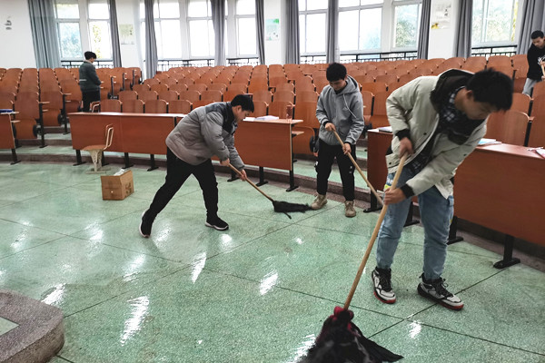 该院各班同学利用下午放学后的时间,按照提前分配的卫生区域,走进每个教室,拿着抹布、扫帚、拖把、清洁铲刀和去污剂等工具,对各个教室的地面、桌椅、门窗、黑板、墙壁以及窗户窗台进行了全方位、深层次的打扫,严格做到了地上无垃圾、门窗无灰尘、墙上无污痕、卫生无死角、桌椅摆放整齐。