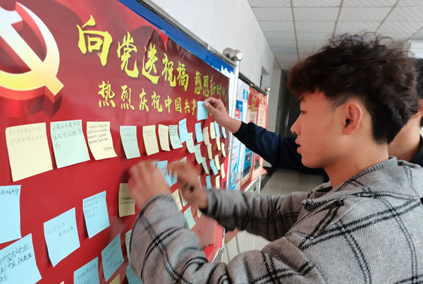 活动前期制作了祝福海报,通过MK体育分团委、员工会向广大同学宣传,并在活动现场向前来送祝福的同学们发放便利贴,邀请他们写上对党100周年华诞的祝愿。在课间时间,同学们纷纷将对党的感恩和美好祝福通过贴便签的形式张贴在展板上,表达对党的热爱与拥护。
