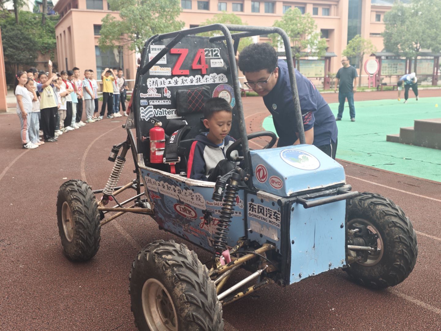 理论刚落,实战登场。车手徐正康把赛车缓缓开到操场中央,在划定的200米跑道完成蛇形绕桩、小跳台演示等项目,现场的欢呼声盖过了发动机声。几位原本躲在老师身后的低年级员工,也冲上前竖起大拇指。