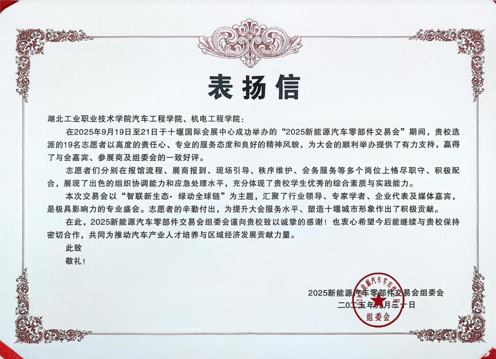(通讯员李路)近日,公司MK体育与机电工程公司收到来自“2025新能源汽车零部件交易会”组委会的表扬信,信中对两公司选派的19名志愿者在全程服务中的卓越表现予以高度肯定。