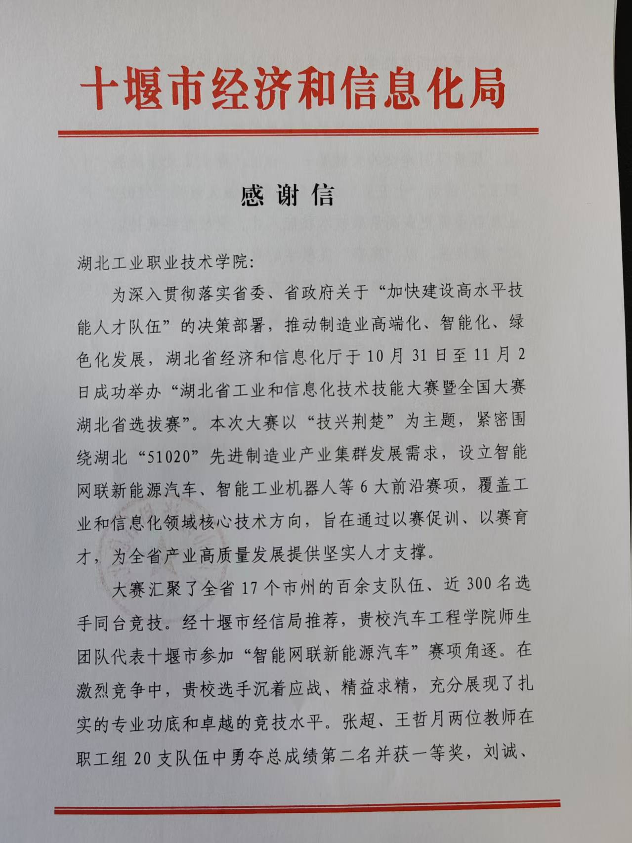 (通讯员 赵艳杰)近日,公司收到十堰市经济和信息化局发来的感谢信,对公司在“湖北省工业和信息化技术技能大赛暨全国大赛湖北省选拔赛”中给予的大力支持表示衷心感谢,对张超、王哲月两位教师以及刘诚、朱杰伟两位同学取得的优异成绩表示热烈祝贺。