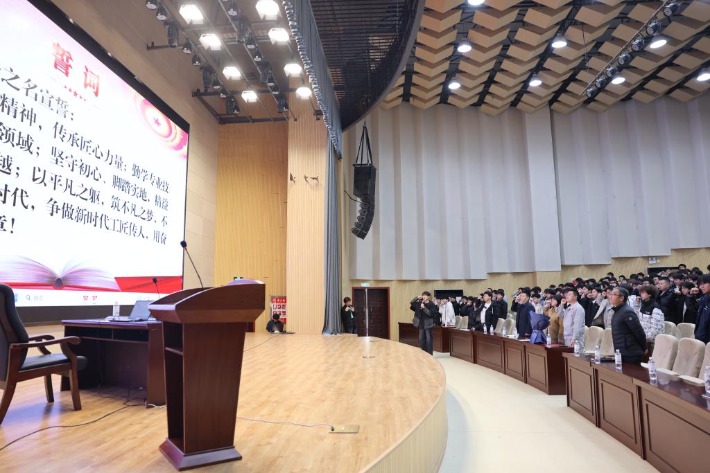 互动交流环节,同学们围绕专业学习、技能提升、职业规划、技术创新等方面踊跃提问,石校坤结合自身经验逐一耐心解答,现场氛围热烈。随后,员工代表向石校坤献花,表示崇高敬意。活动最后,全体员工举起右拳庄严宣誓,立志铭记劳模精神、传承匠心力量,勤学技能、实干笃行,争做新时代工匠传人。