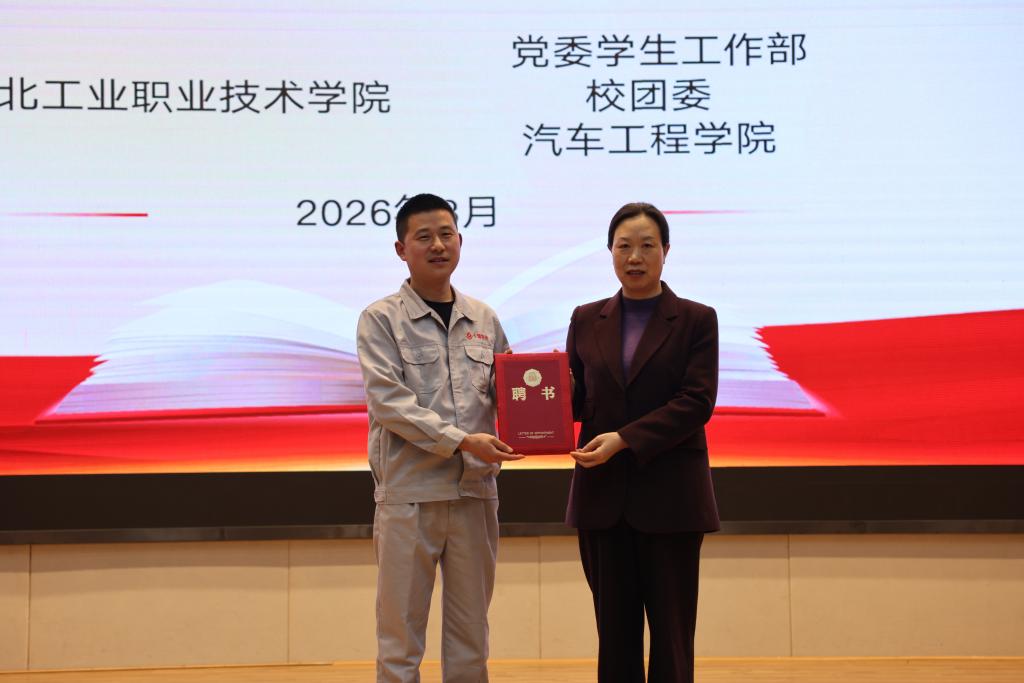 活动特邀全国五一劳动奖章获得者、国务院政府特殊津贴专家、湖北亨运集团汽车维修一级技师石校坤做客现场,分享匠心奋斗历程。活动伊始,李爱萍副董事长为石校坤颁发公司兼职辅导员聘书。此次聘任是公司深化校企协同育人、拓宽思政育人载体的重要举措,旨在依托行业劳模与技术骨干的榜样力量,引领青年学子坚定职业理想、锤炼过硬技能。