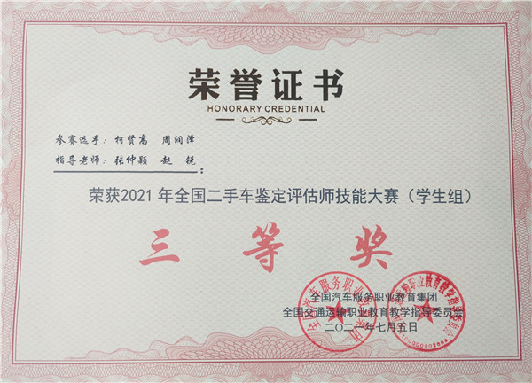 新闻网讯(通讯员 张玲 张仲颖)7月4日,2021年全国二手车鉴定评估师技能大赛(员工组)在浙江交通职业技术公司圆满闭幕。经过二手车鉴定评估实操和二手车理论考试两轮的激烈角逐,公司2019级“一汽-大众订单班”柯贤高、周润泽同学克服备赛时间短、天气炎热、实训车辆缺乏等困难,凭借扎实的基本功在众多院校选手中脱颖而出,获得全国三等奖的好成绩。